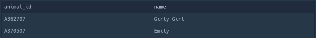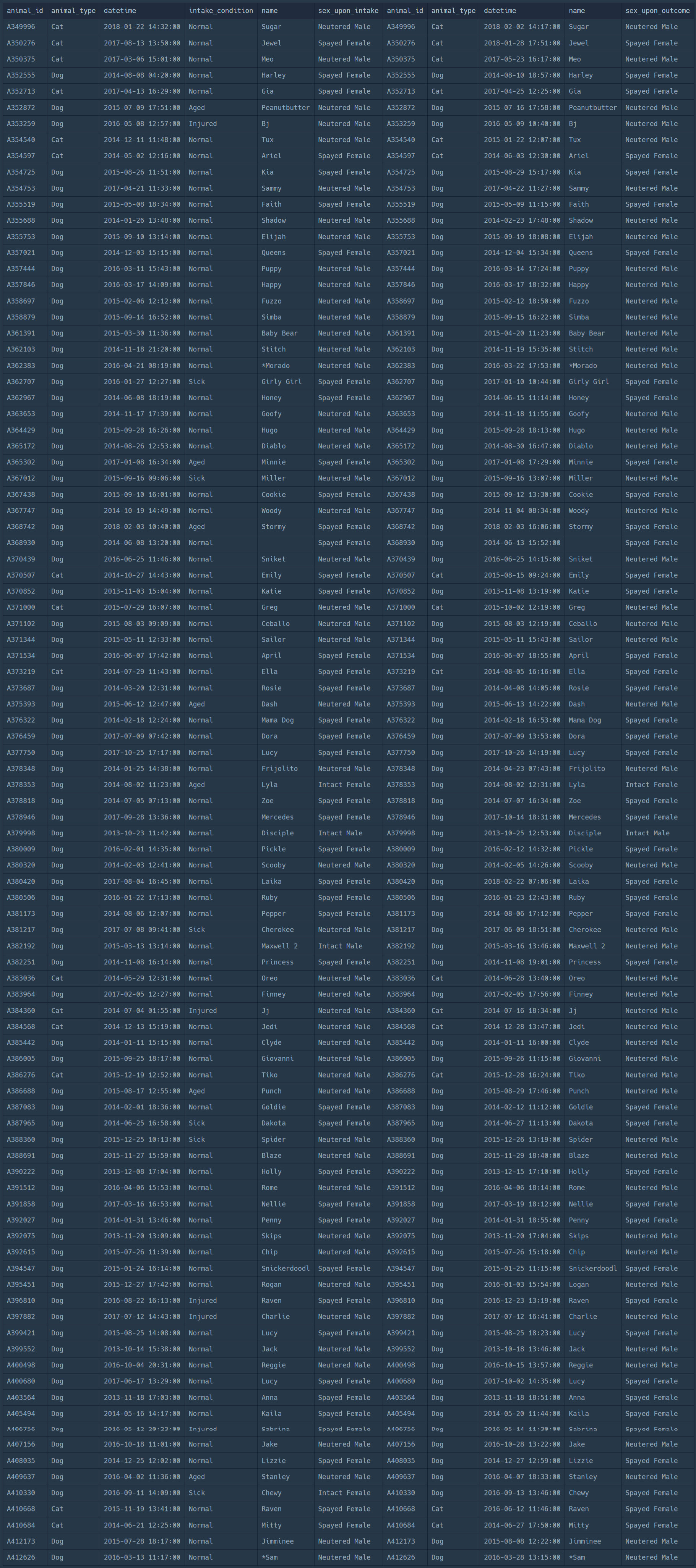 | ANIMAL_ID | ANIMAL_TYPE | DATETIME | NAME | SEX_UPON_OUTCOME |