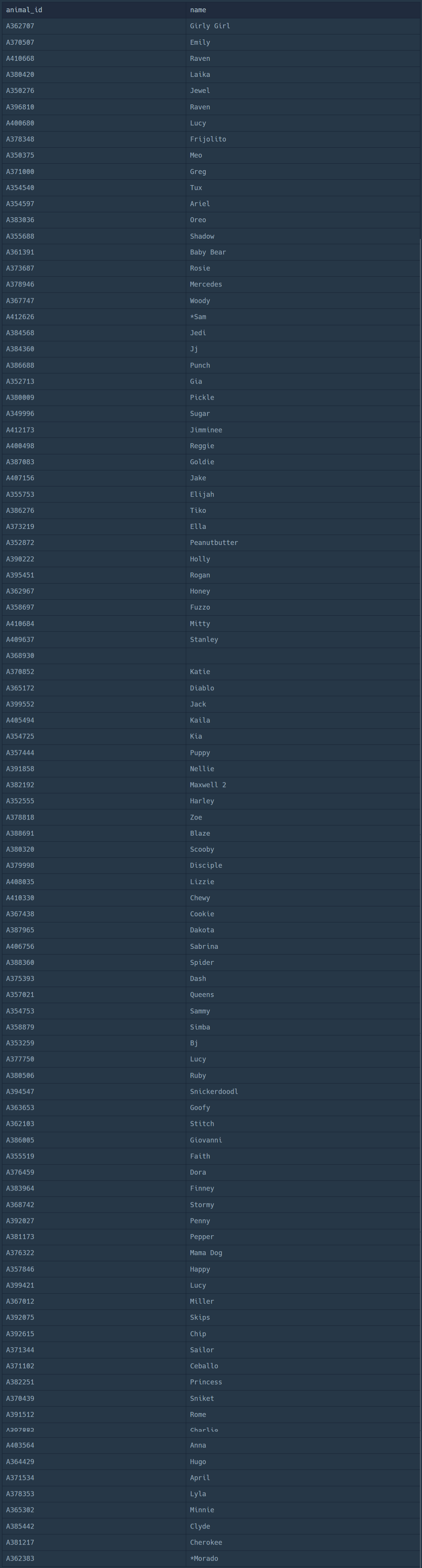 | ANIMAL_ID | NAME |