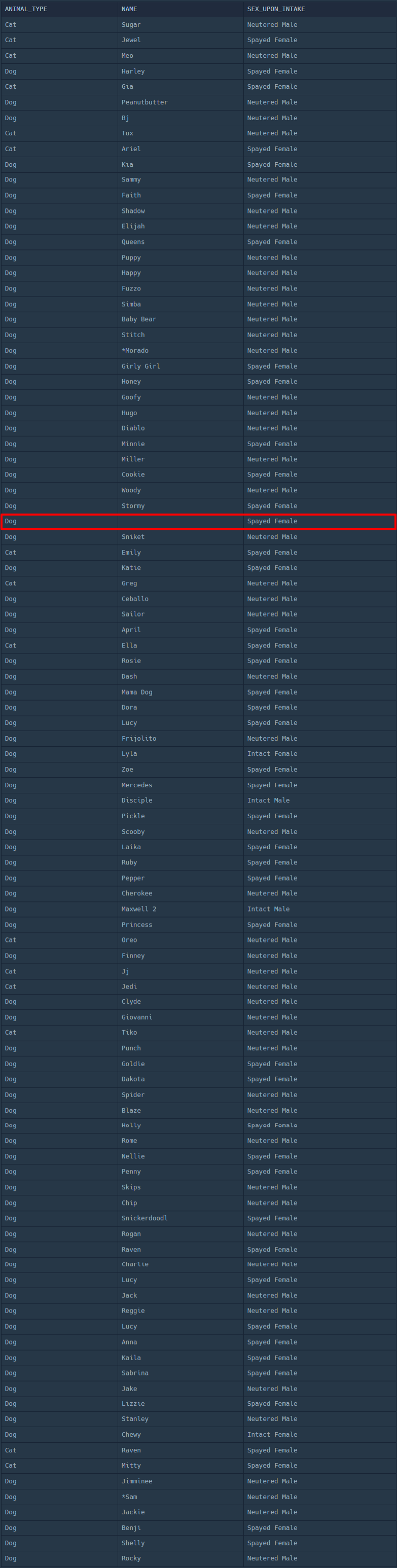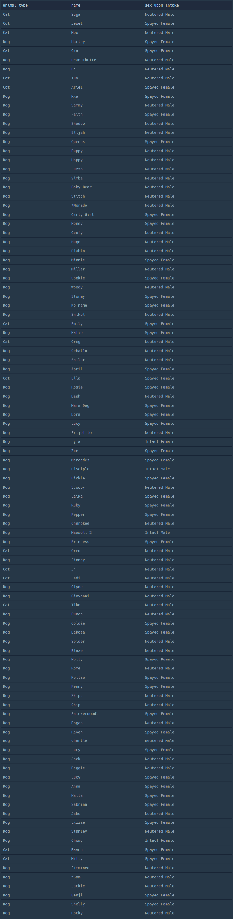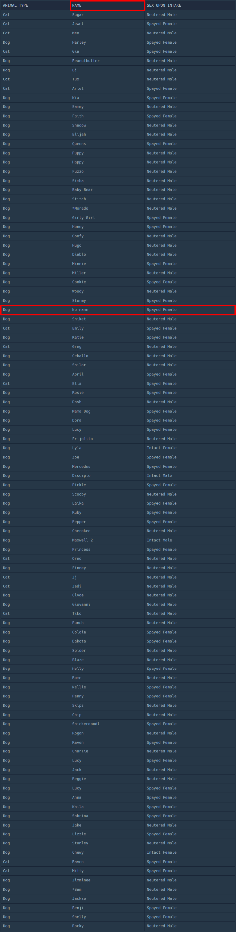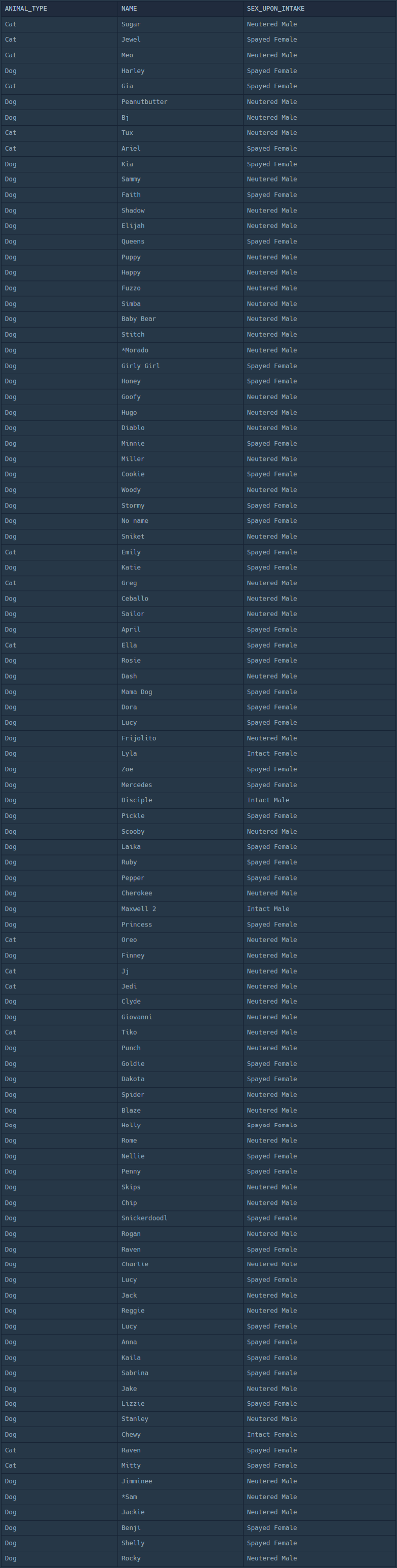 | ANIMAL_TYPE | NAME | SEX_UPON_INTAKE |