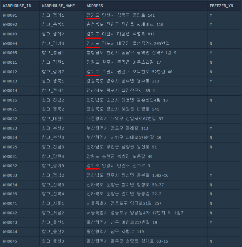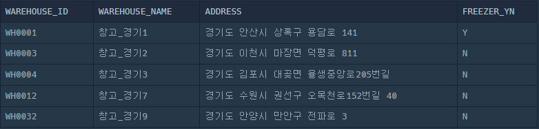 📌 오늘 만난 문제 : FOOD_WAREHOUSE 테이블에서 경기도에 위치한 창고의 ID, 이름, 주소, 냉동시설 여부를 조회하는 SQL문을 작성해주세요.