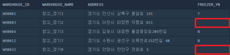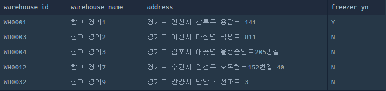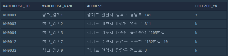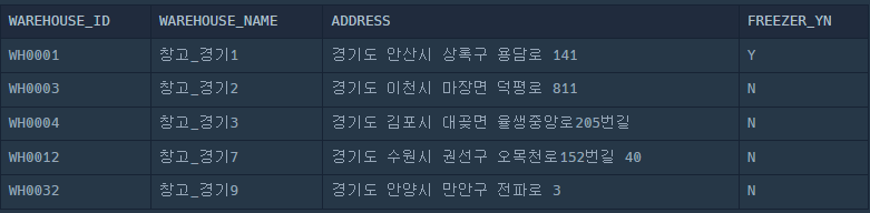 | WAREHOUSE_ID | WAREHOUSE_NAME | ADDRESS | TLNO | FREEZER_YN |