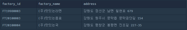 2. 위의 조회 결과에서 강원도에 위치한 식품공장만 조회하자.
