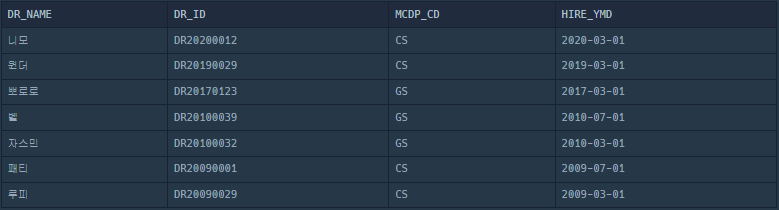 | DR_NAME | DR_ID | MCDP_CD | HIRE_YMD |