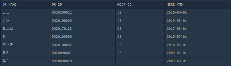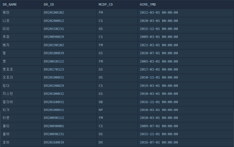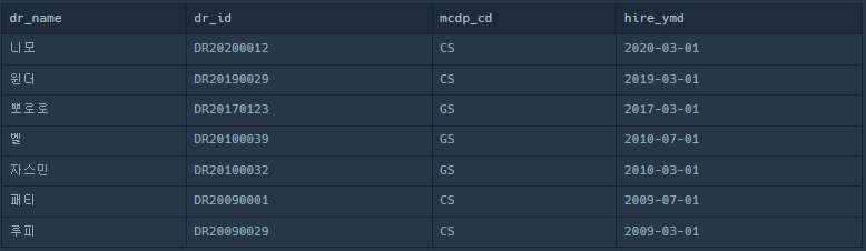| DR_NAME | DR_ID | MCDP_CD | HIRE_YMD |