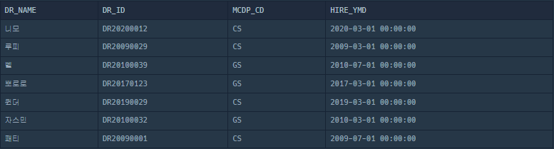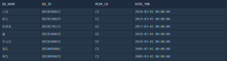SELECT DR_NAME , DR_ID , MCDP_CD , HIRE_YMD FROM DOCTOR WHERE MCDP_CD IN ('CS', 'GS') ORDER BY HIRE_YMD DESC , DR_NAME ASC;실행 결과