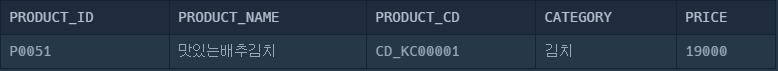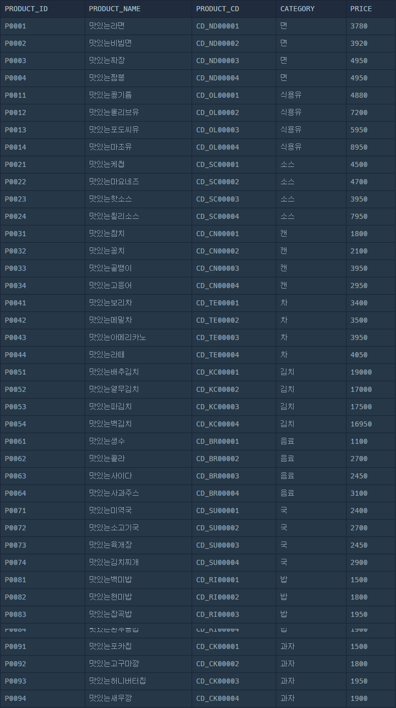 | PRODUCT_ID | PRODUCT_NAME | PRODUCT_CD | CATEGORY | PRICE |