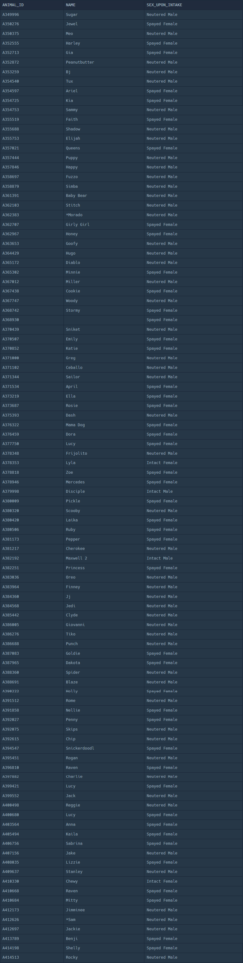 | ANIMAL_ID | ANIMAL_TYPE | DATETIME | INTAKE_CONDITION | NAME | SEX_UPON_INTAKE |