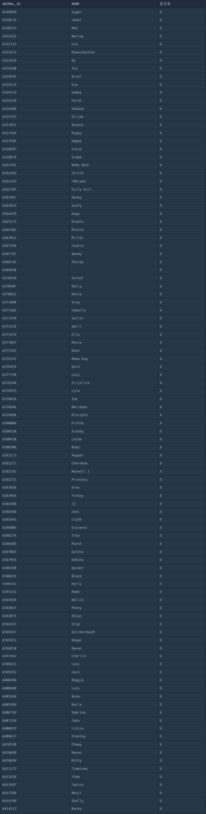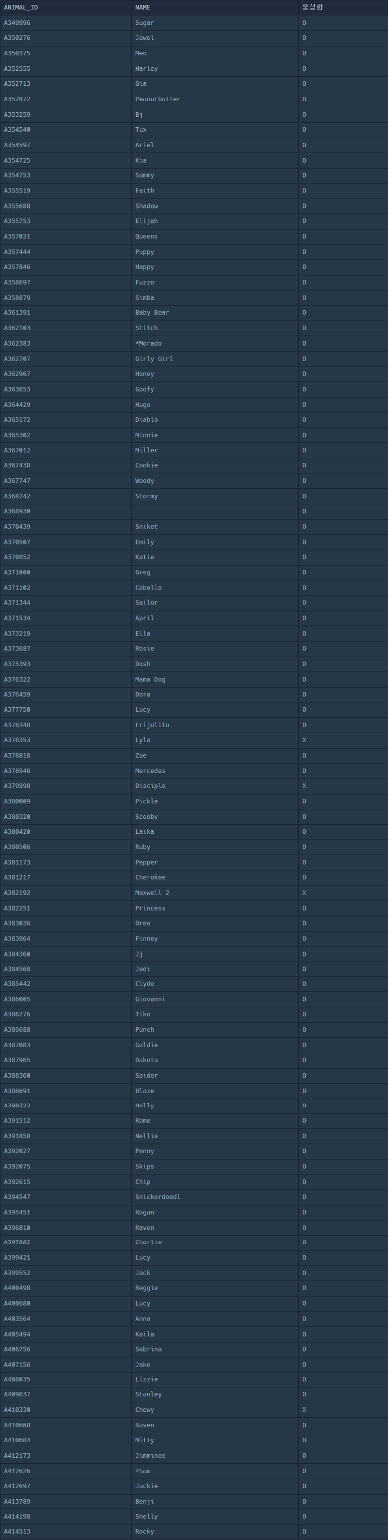 SELECT ANIMAL_ID , NAME , IF((SEX_UPON_INTAKE LIKE 'Neutered%') OR (SEX_UPON_INTAKE LIKE 'Spayed%'), 'O' , 'X') "중성화" FROM ANIMAL_INS ORDER BY ANIMAL_ID;실행 결과