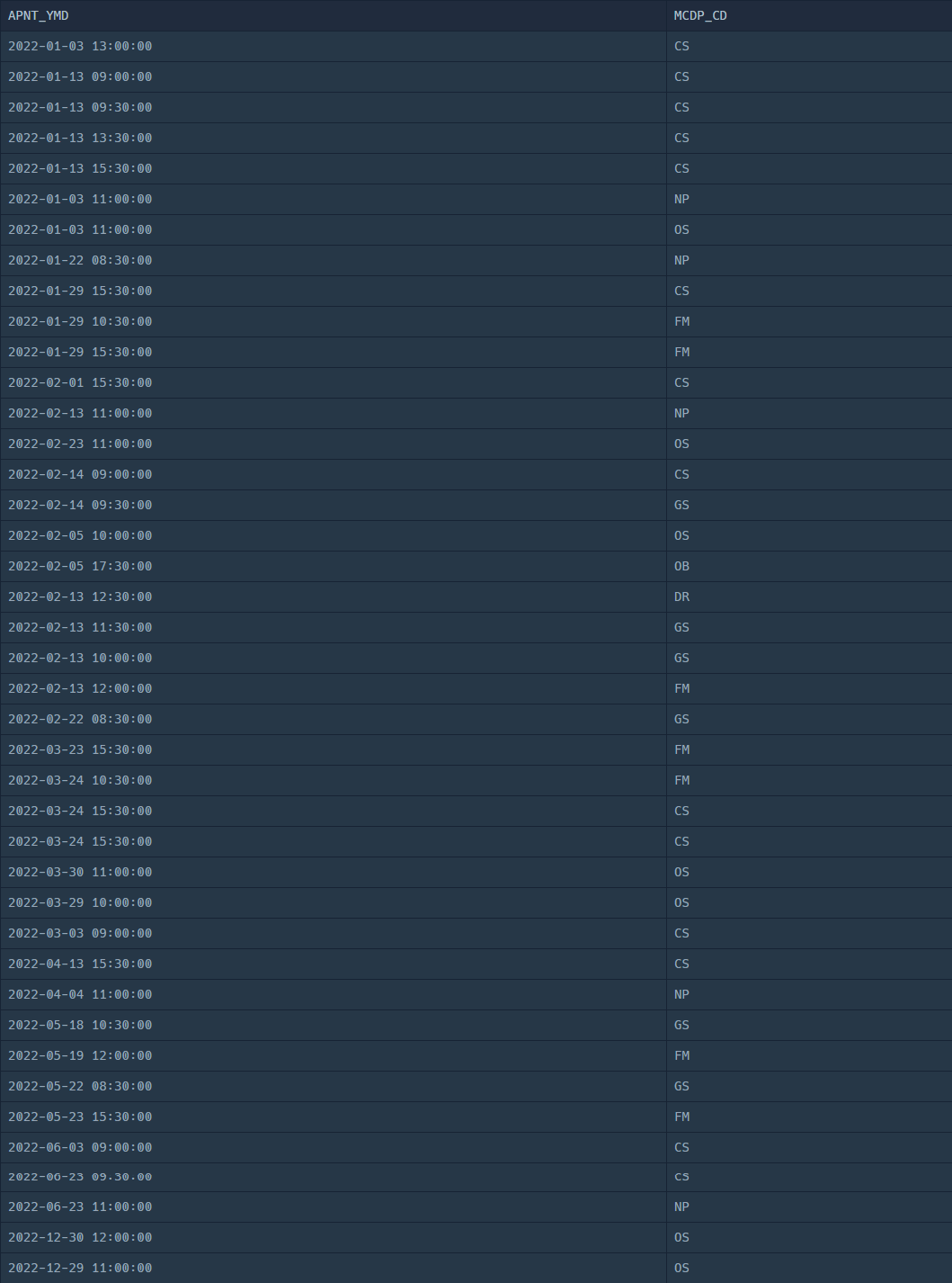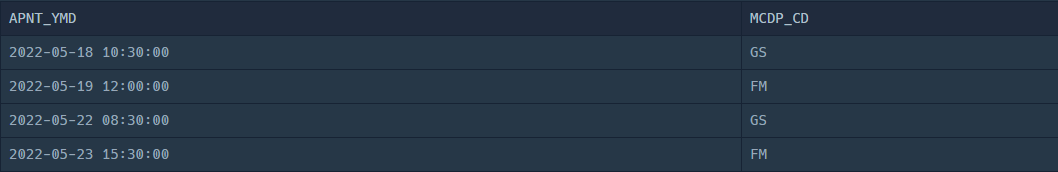 SELECT APNT_YMD , MCDP_CD FROM APPOINTMENT;실행 결과