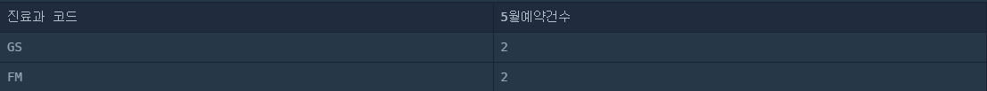 SELECT MCDP_CD "진료과 코드" , COUNT(*) "5월예약건수" FROM APPOINTMENT WHERE DATE_FORMAT(APNT_YMD, '%Y-%m') = '2022-05' GROUP BY MCDP_CD;실행 결과