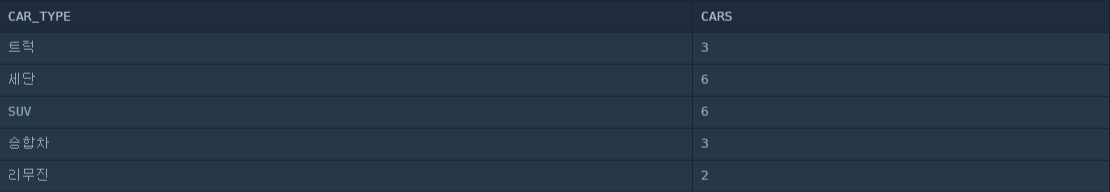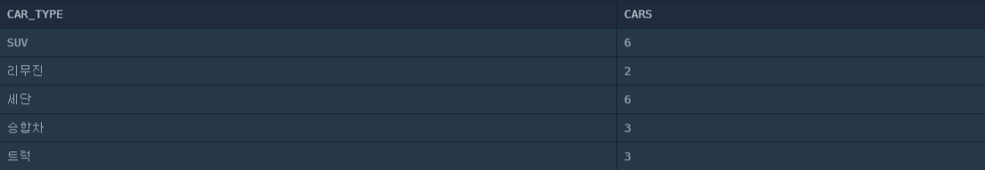 SELECT CAR_TYPE , COUNT(*) CARS FROM CAR_RENTAL_COMPANY_CAR WHERE OPTIONS LIKE '%통풍시트%' OR OPTIONS LIKE '%열선시트%' OR OPTIONS LIKE '%가죽시트%' GROUP BY CAR_TYPE;실행 결과