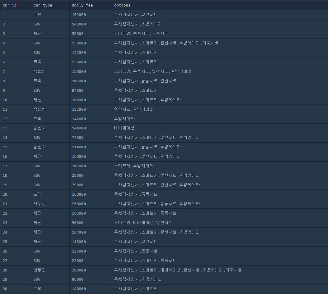 SELECT * FROM CAR_RENTAL_COMPANY_CAR;실행 결과