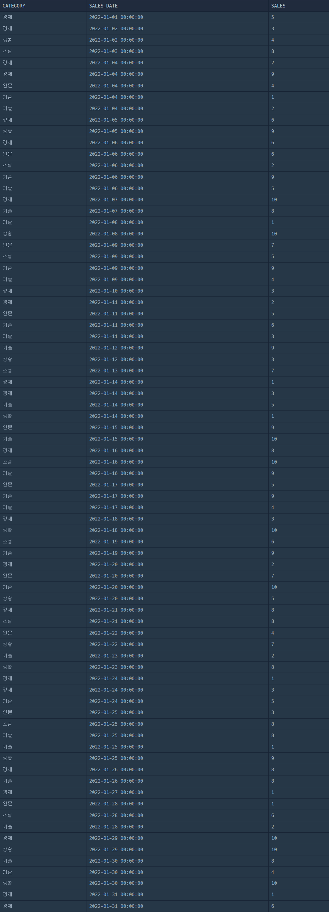 SELECT B.CATEGORY , S.SALES_DATE , S.SALES FROM BOOK B , BOOK_SALES S WHERE B.BOOK_ID = S.BOOK_ID;실행 결과
