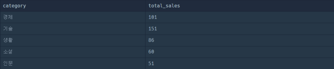 SELECT B.CATEGORY , SUM(S.SALES) TOTAL_SALES FROM BOOK B , BOOK_SALES S WHERE B.BOOK_ID = S.BOOK_ID AND DATE_FORMAT(S.SALES_DATE, '%Y-%m') = '2022-01' GROUP BY B.CATEGORY;실행 결과