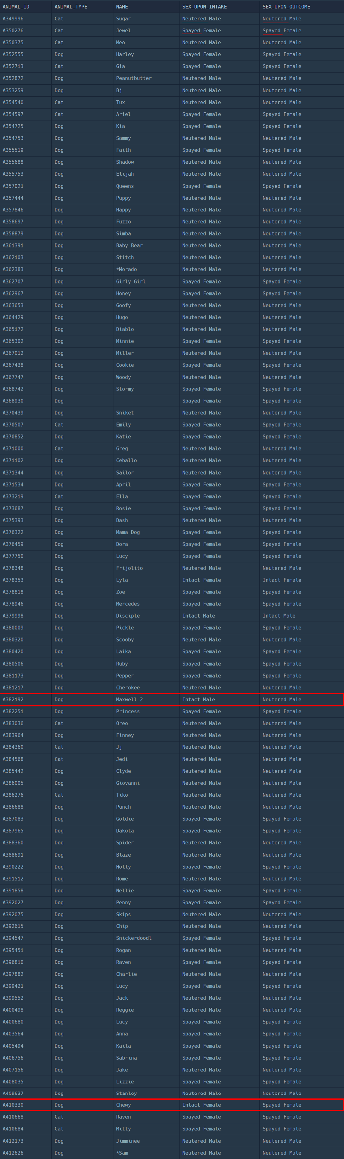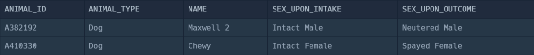 SELECT I.ANIMAL_ID , I.ANIMAL_TYPE , I.NAME , I.SEX_UPON_INTAKE , O.SEX_UPON_OUTCOME FROM ANIMAL_INS I , ANIMAL_OUTS O WHERE I.ANIMAL_ID = O.ANIMAL_ID AND I.SEX_UPON_INTAKE LIKE 'Intact%' AND (O.SEX_UPON_OUTCOME LIKE 'Spayed%' OR O.SEX_UPON_OUTCOME LIKE 'Neutered%');실행 결과