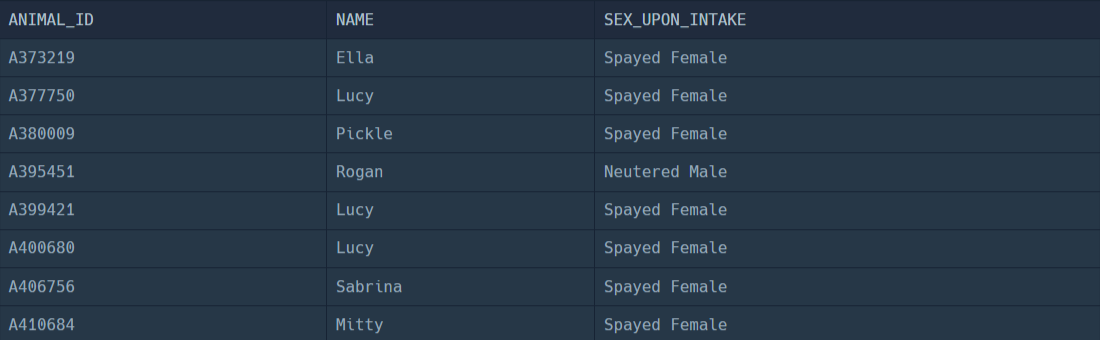 SELECT ANIMAL_ID , NAME , SEX_UPON_INTAKE FROM ANIMAL_INS WHERE NAME IN ('Lucy', 'Ella', 'Pickle', 'Rogan', 'Sabrina', 'Mitty');실행 결과