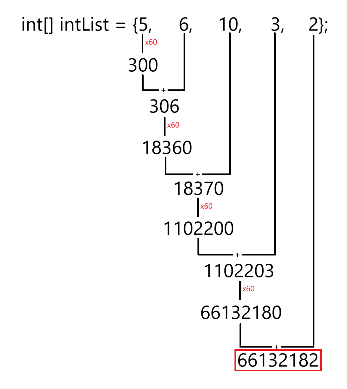 .reduce(0, (x, y) -> x * 60 + y); // (((5 * 60)+ 6) * 60 + 10) * 60 + 3) * 60 + 2