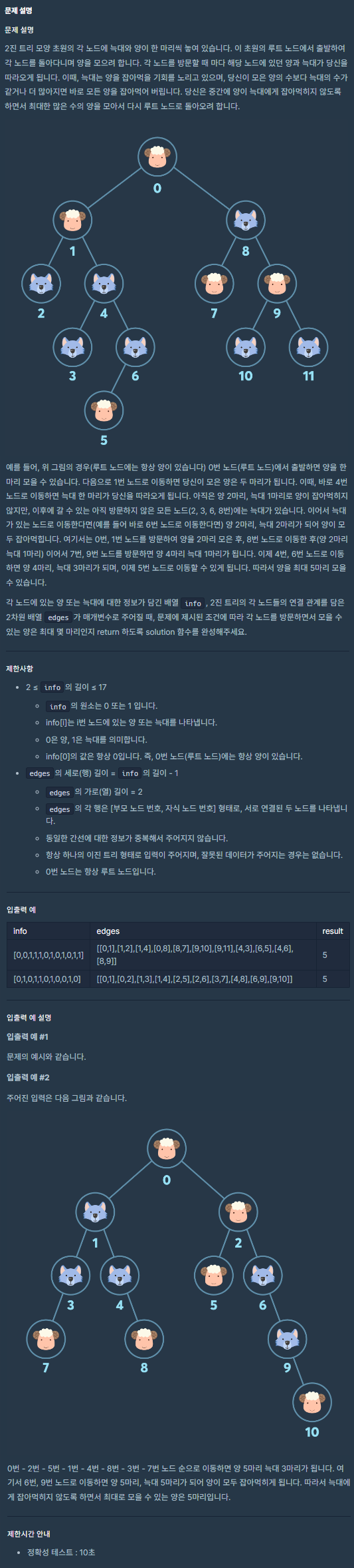 - info : 각 노드에 있는 양 또는 늑대에 대한 정보가 담긴 배열(양 = 0, 늑대 = 1)