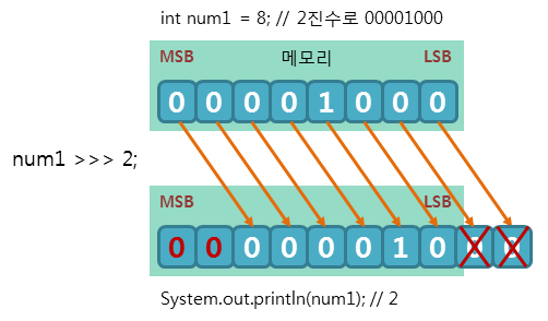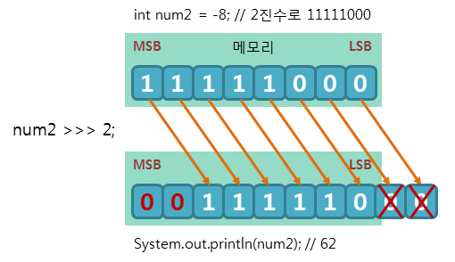 int x = 0B00001111; System.out.printf("%16s","x = "); System.out.println(String.format("%32s",Integer.toBinaryString(x)).replace(" ", "0")); x >>>= 3; System.out.printf("%-12s","x >>>= 3; "); System.out.println("x = " + String.format("%32s",Integer.toBinaryString(x)).replace(" ", "0"));Output(출력)