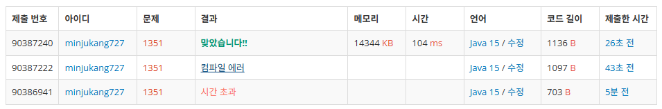 중간에 import를 빼먹어서 한번 컴파일 에러가 발생했지만 성공적으로 제출하였습니다.