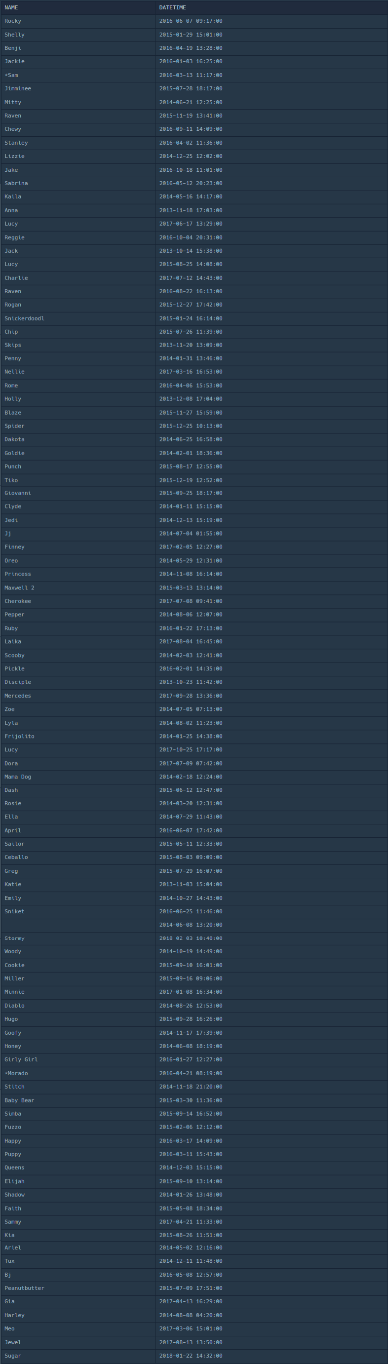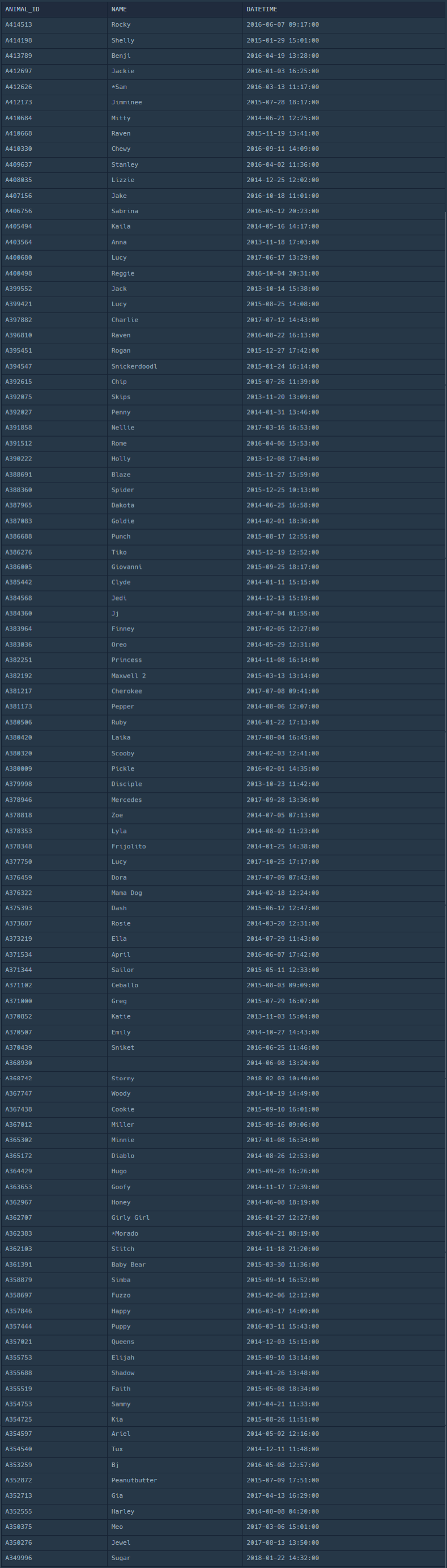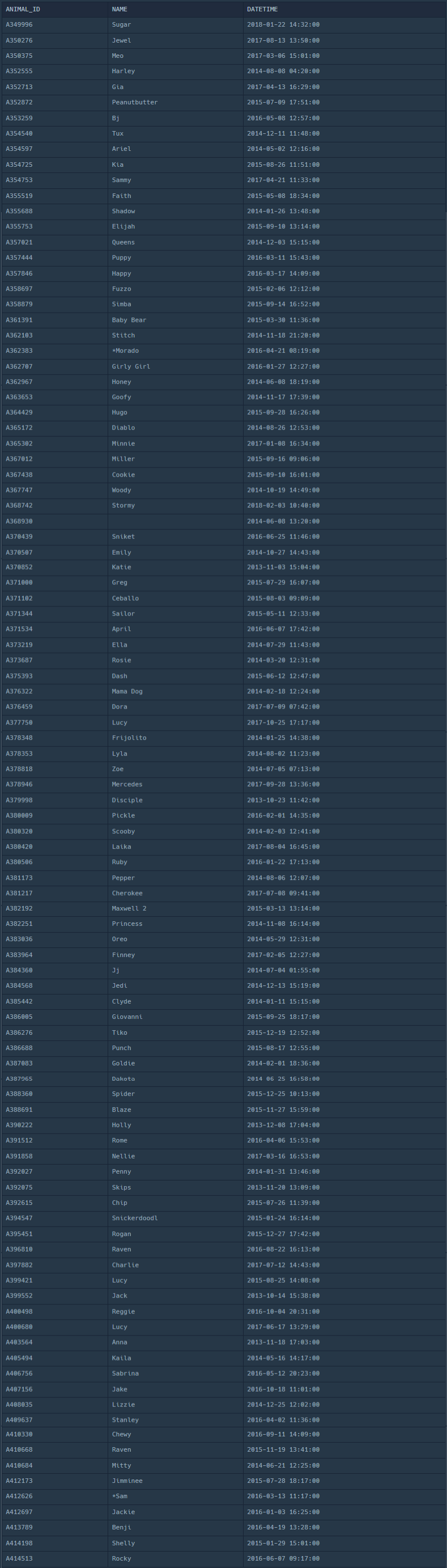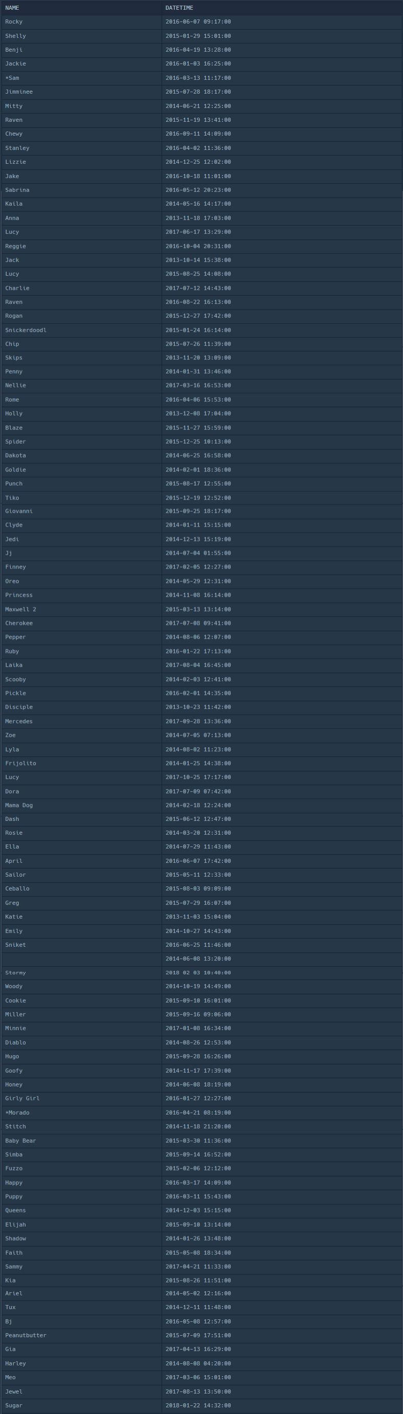 ANIMAL_ID칼럼이 빠지고 NAME, DATETIME칼럼만 잘 조회된 것을 확인할 수 있다..