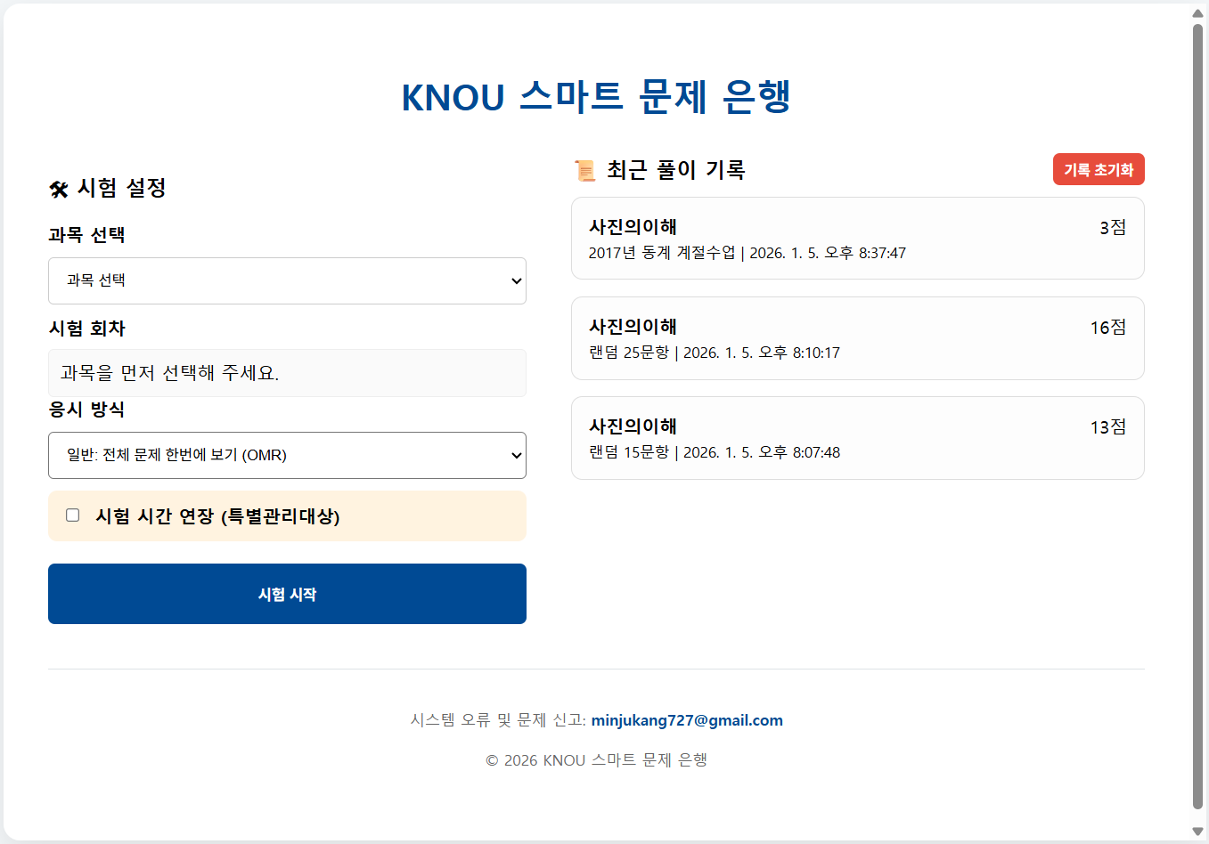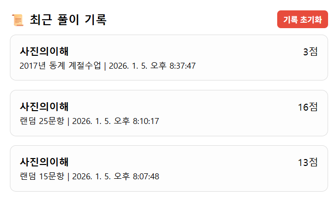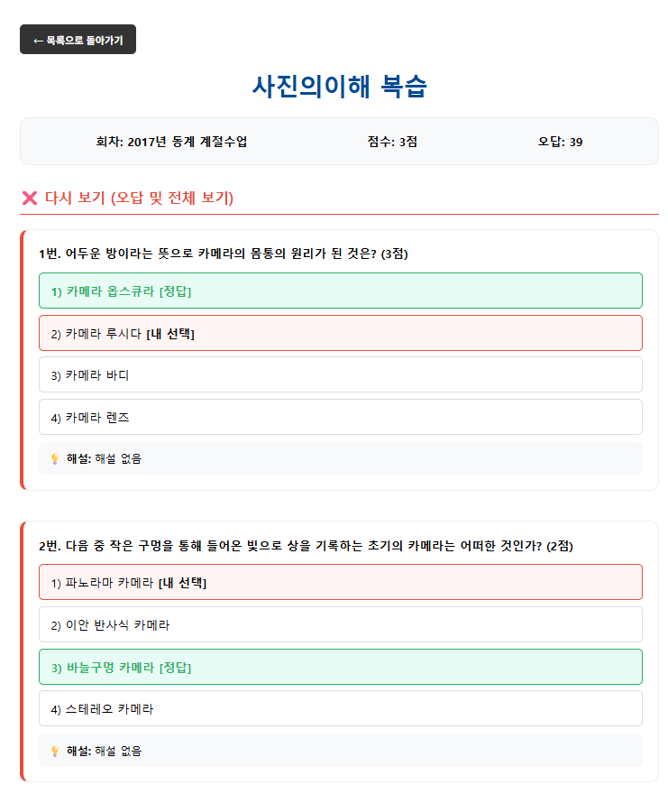 - 오답 복습: 응시한 회차 선택하면 해당 회차의 오답 재확인 가능