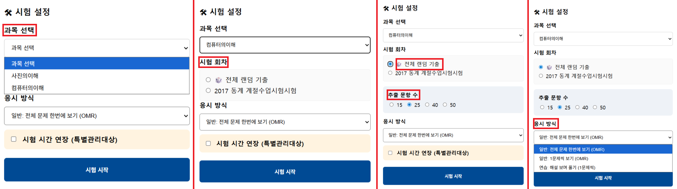 - 과목/시험 회차/응시 방식 선택