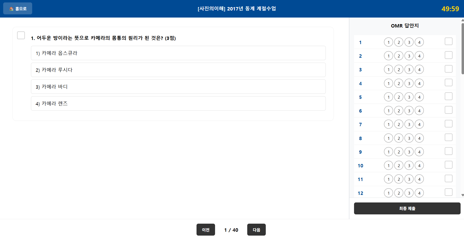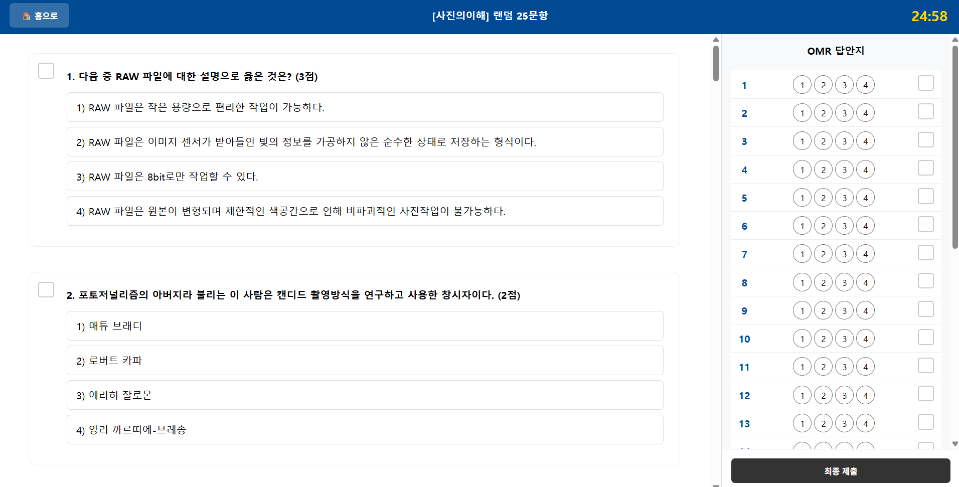 - 정답 마킹: 왼쪽 문제 혹은 오른쪽 OMR 마킹지에서 마킹