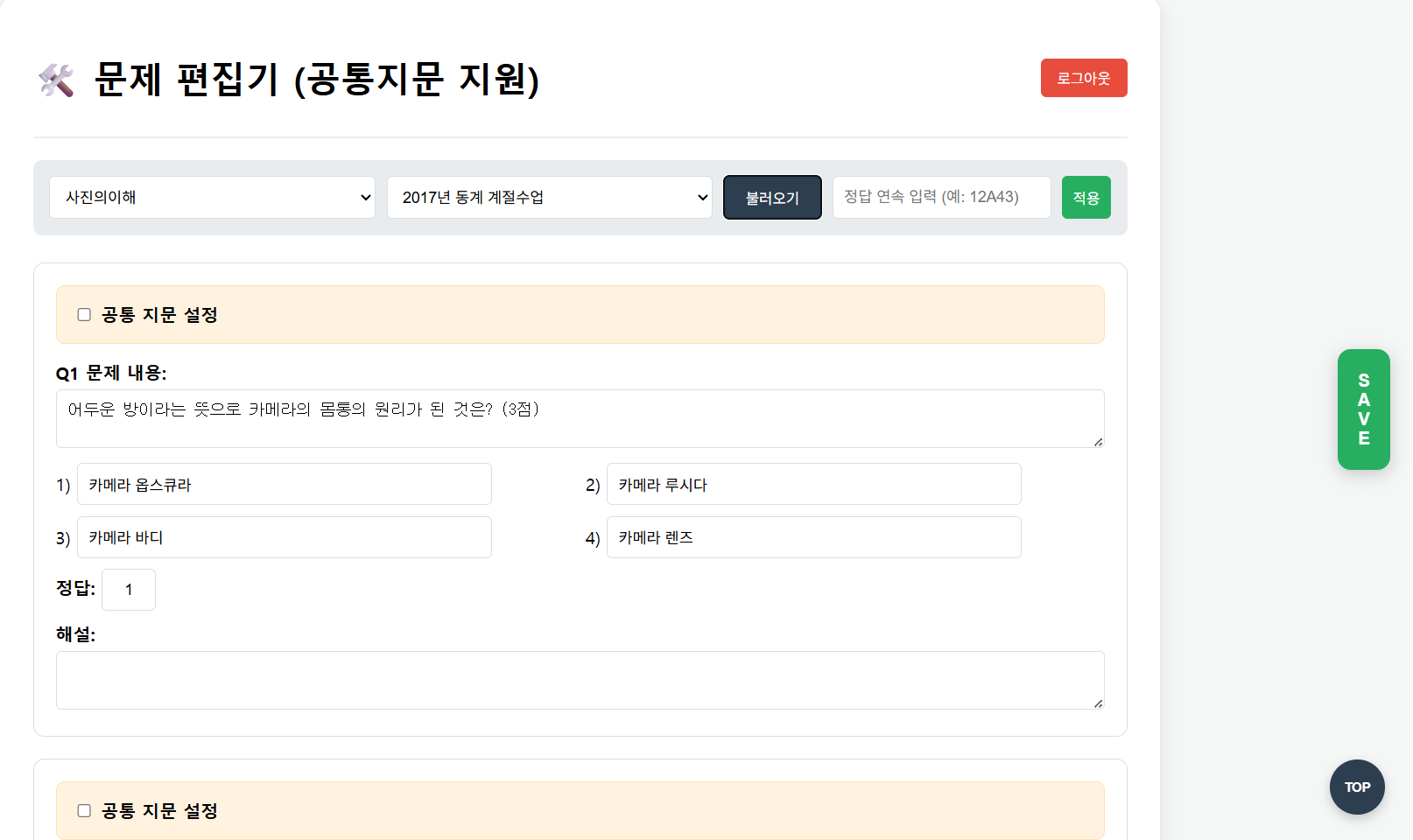 시험 문제, 정답, 풀이, 공통지문, 이미지 추가/변경/삭제 용