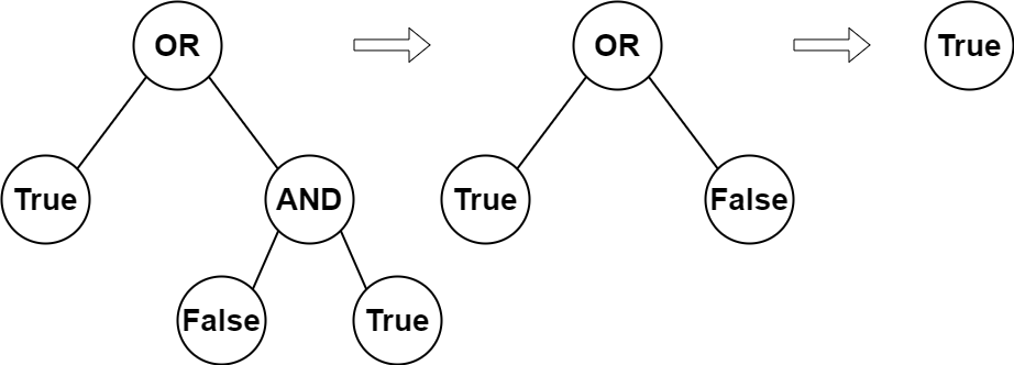 TrueorFalse. - Otherwise, evaluate the node's two children and apply the boolean operation of its value with the children's evaluations.